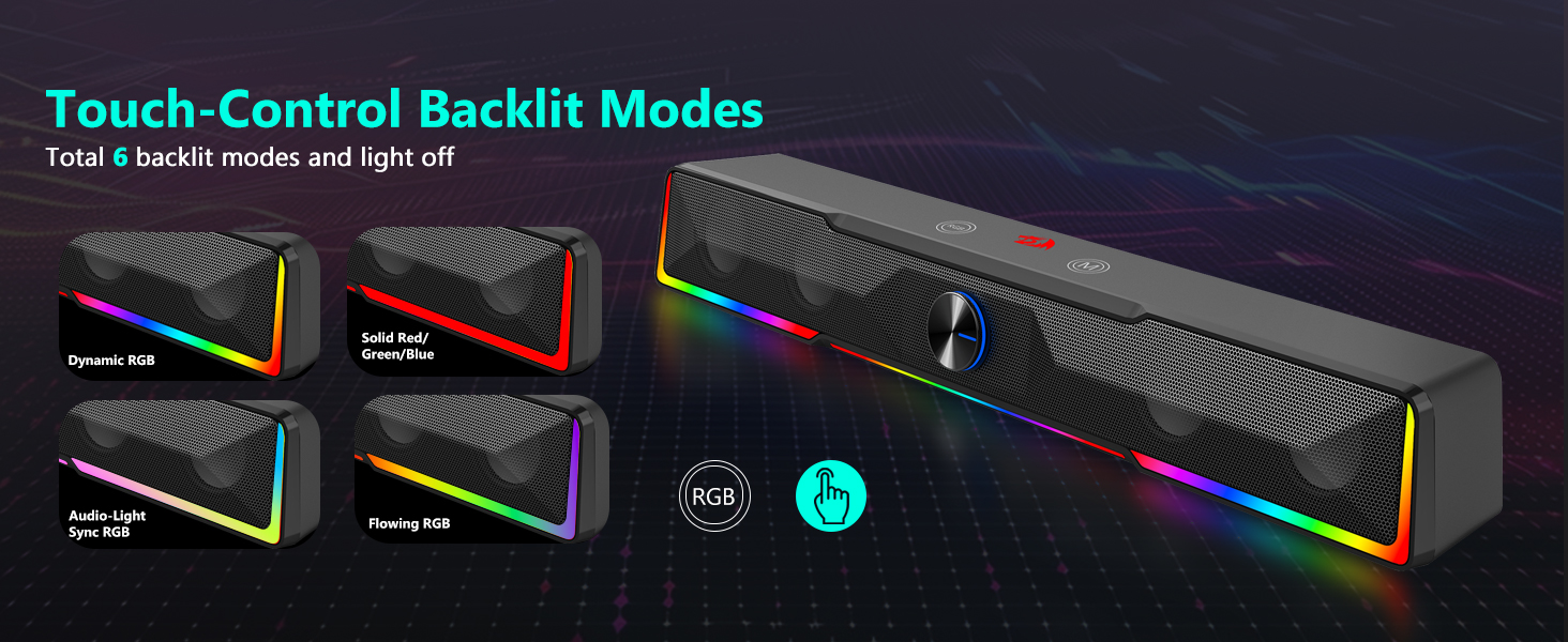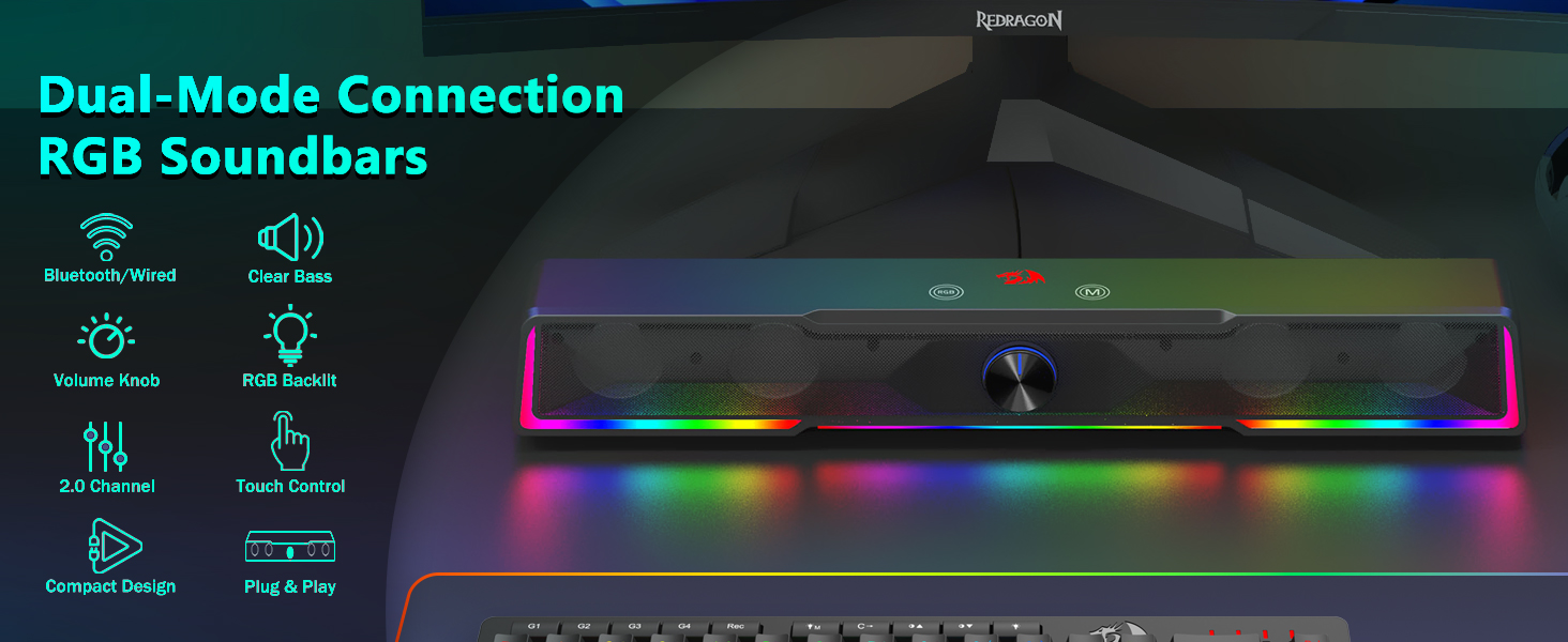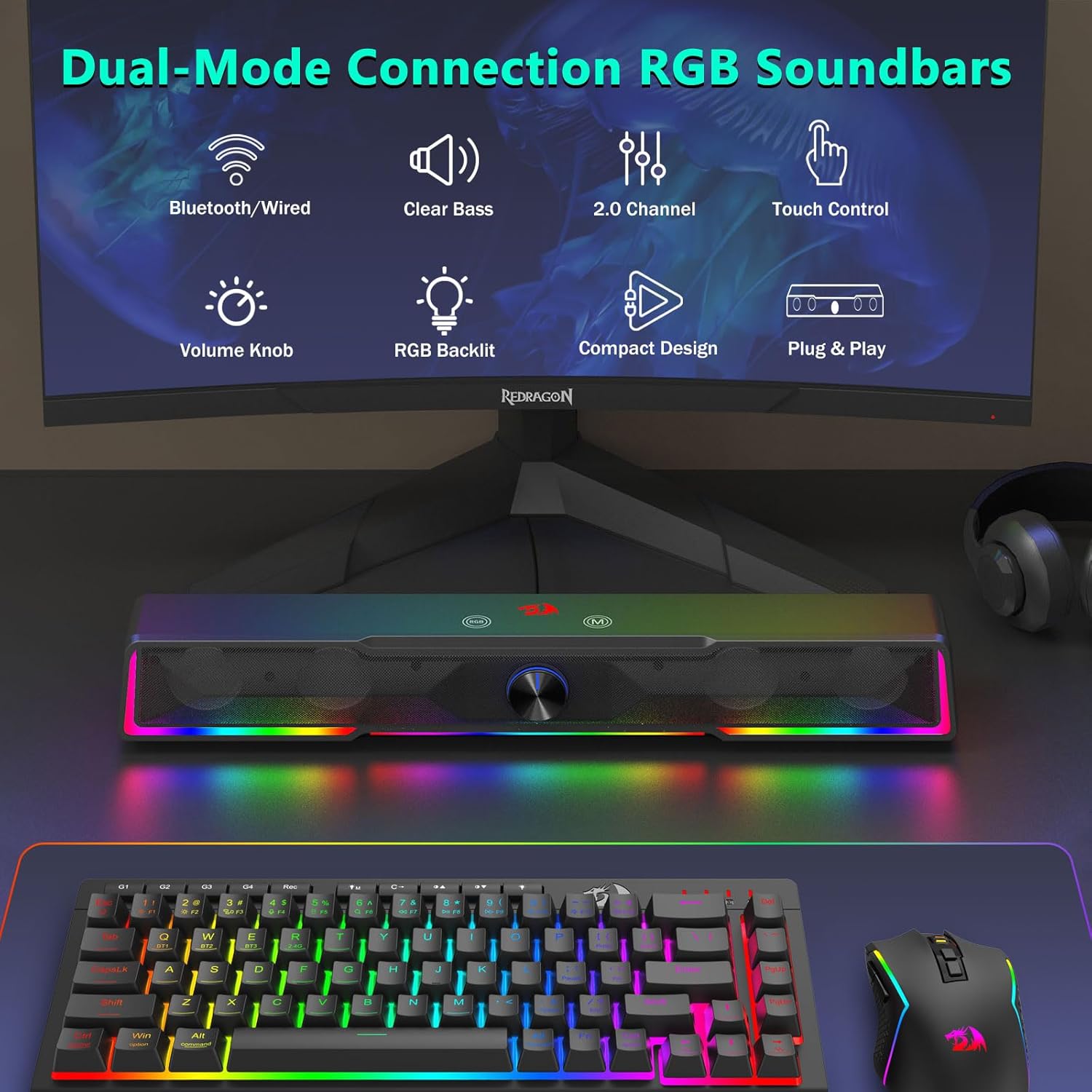 黑色 GS516 蓝牙/USB 有线连接 Soundbar 音量旋钮电脑扬声器是一款紧凑型桌面音频设备,旨在为电脑和多媒体设备提供高品质声音。它将现代条形音箱美学与先进的连接选项相结合,使其适用于有线和无线音频播放。