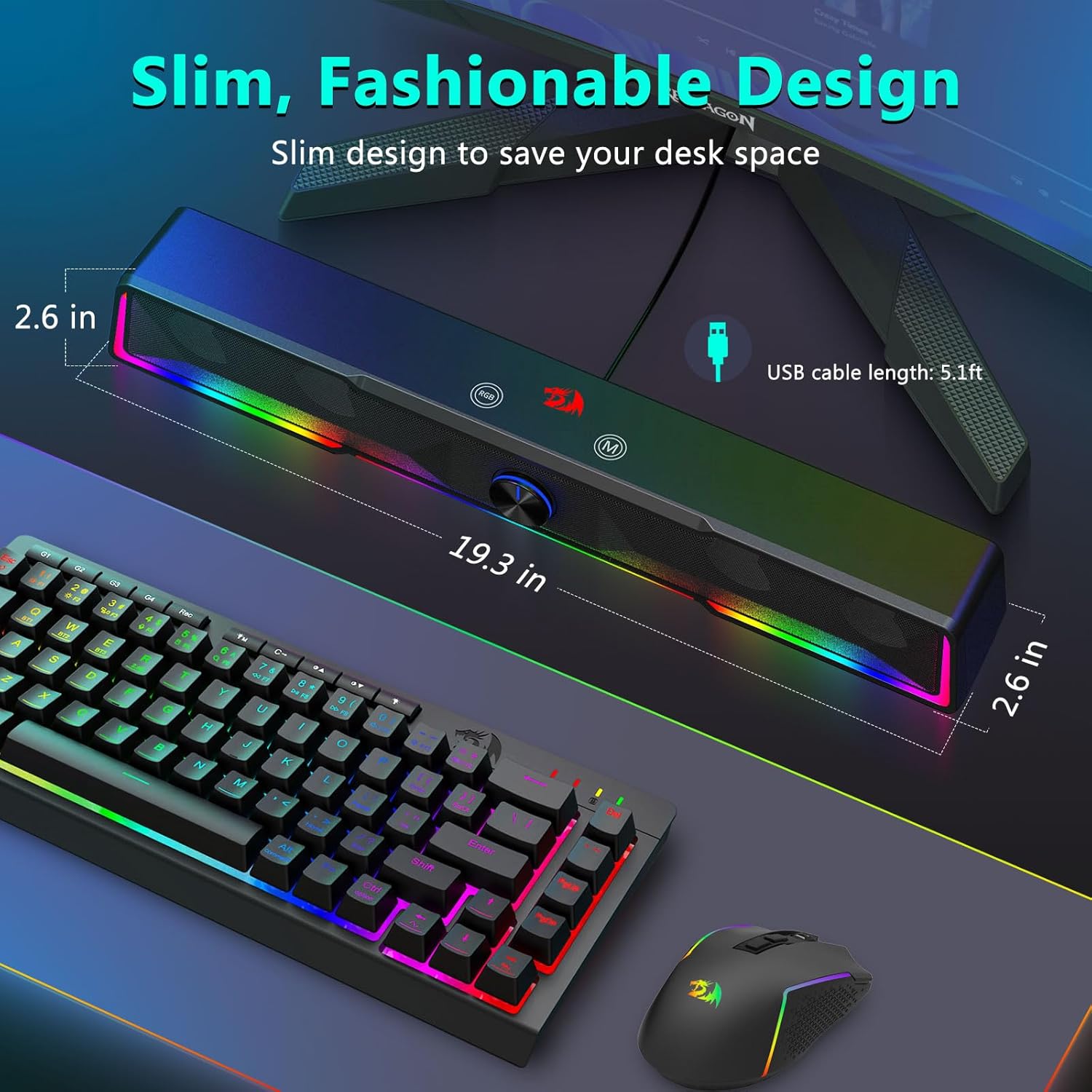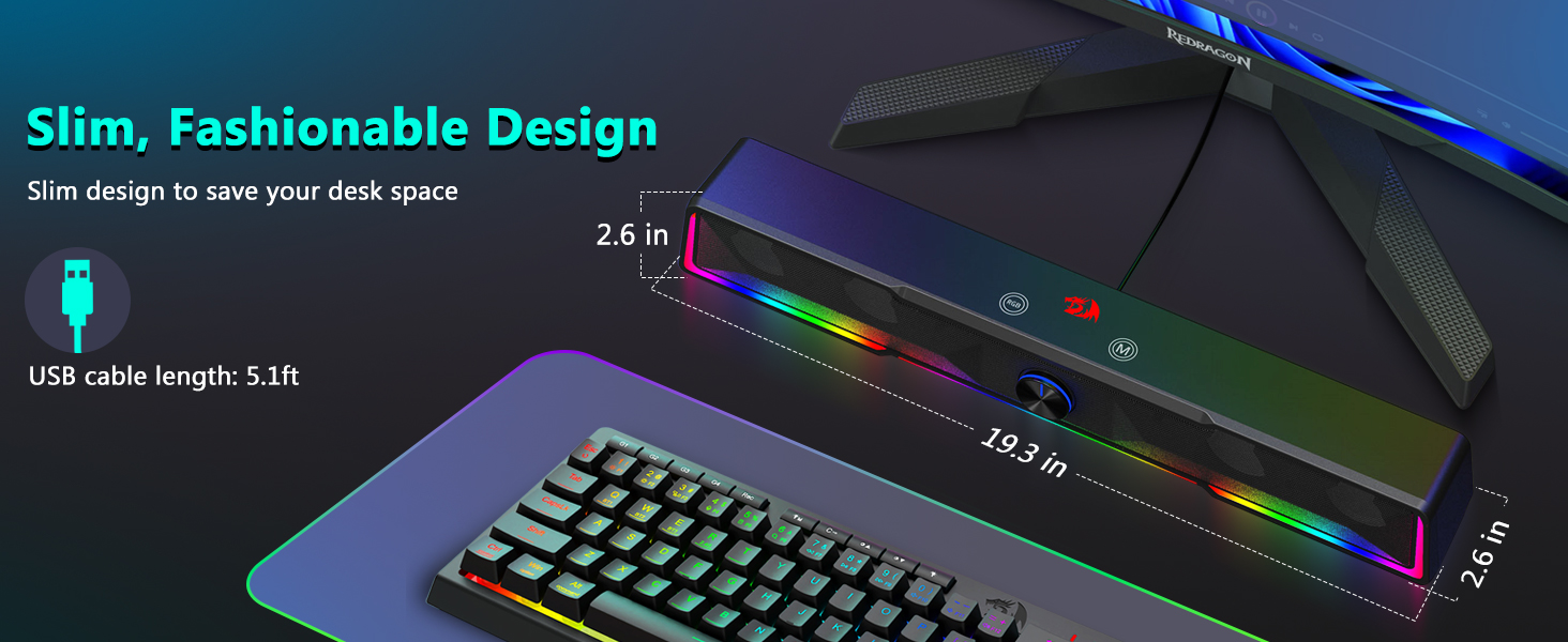 与占据显示器两侧大面积的传统扬声器不同,黑色 GS516 蓝牙/USB 有线连接 Soundbar 音量旋钮电脑扬声器采用纤薄的 soundbar 结构,可方便地安装在大多数电脑屏幕下方。