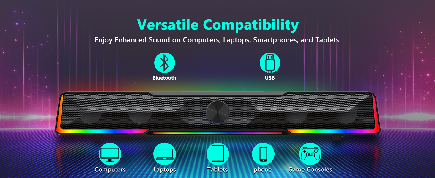 与传统笨重的扬声器系统不同,这款条形音箱可以整齐地安装在显示器或笔记本电脑支架下,节省宝贵的桌面空间,同时提供身临其境的音频性能。黑色 GS516 蓝牙/USB 有线连接 Soundbar 音量旋钮电脑扬声器具有蓝牙和 USB 有线连接选项,可与多种设备(包括台式电脑、笔记本电脑、平板电脑和智能手机)实现多功能兼容性。
