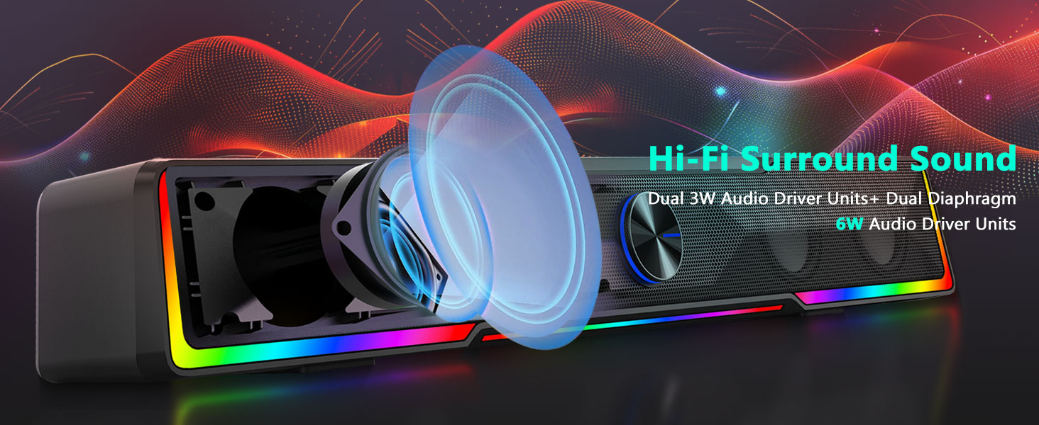 黑色 GS516 蓝牙/USB 有线连接 Soundbar 音量旋钮电脑扬声器配备强大的立体声驱动器,可提供平衡的声音、清晰的人声、细致的中频和增强的低音响应。