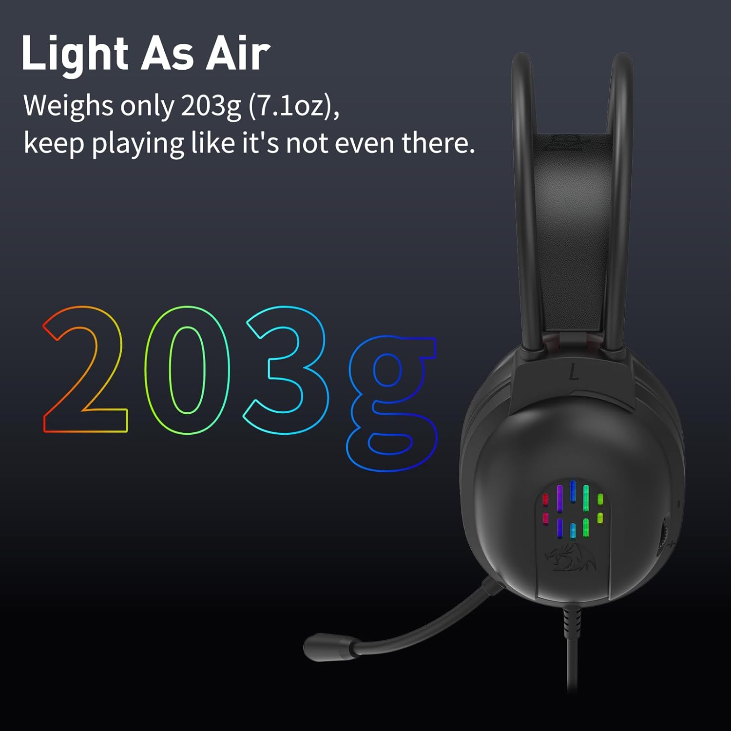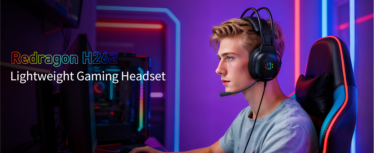 带麦克风的黑色 H262 有线游戏耳机采用轻质结构和符合人体工程学的耳垫,让您在长时间游戏时也能感到舒适。