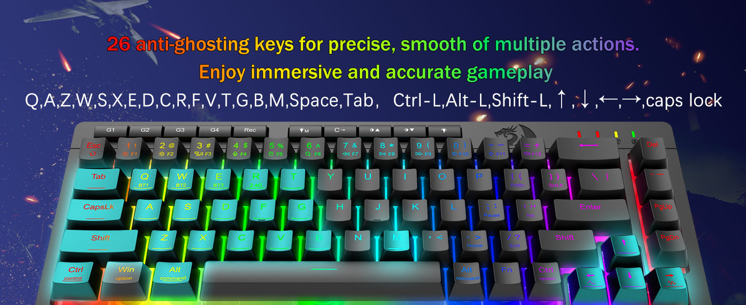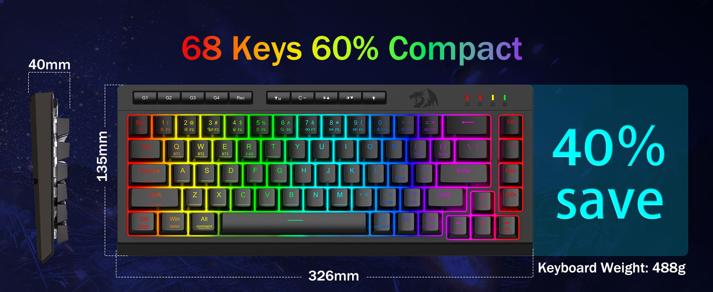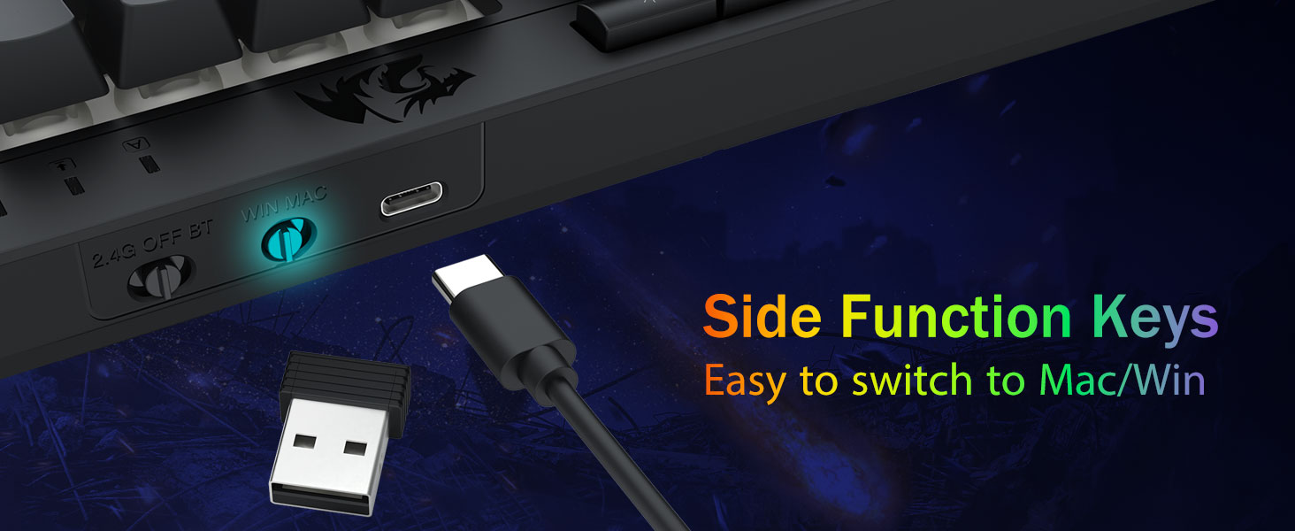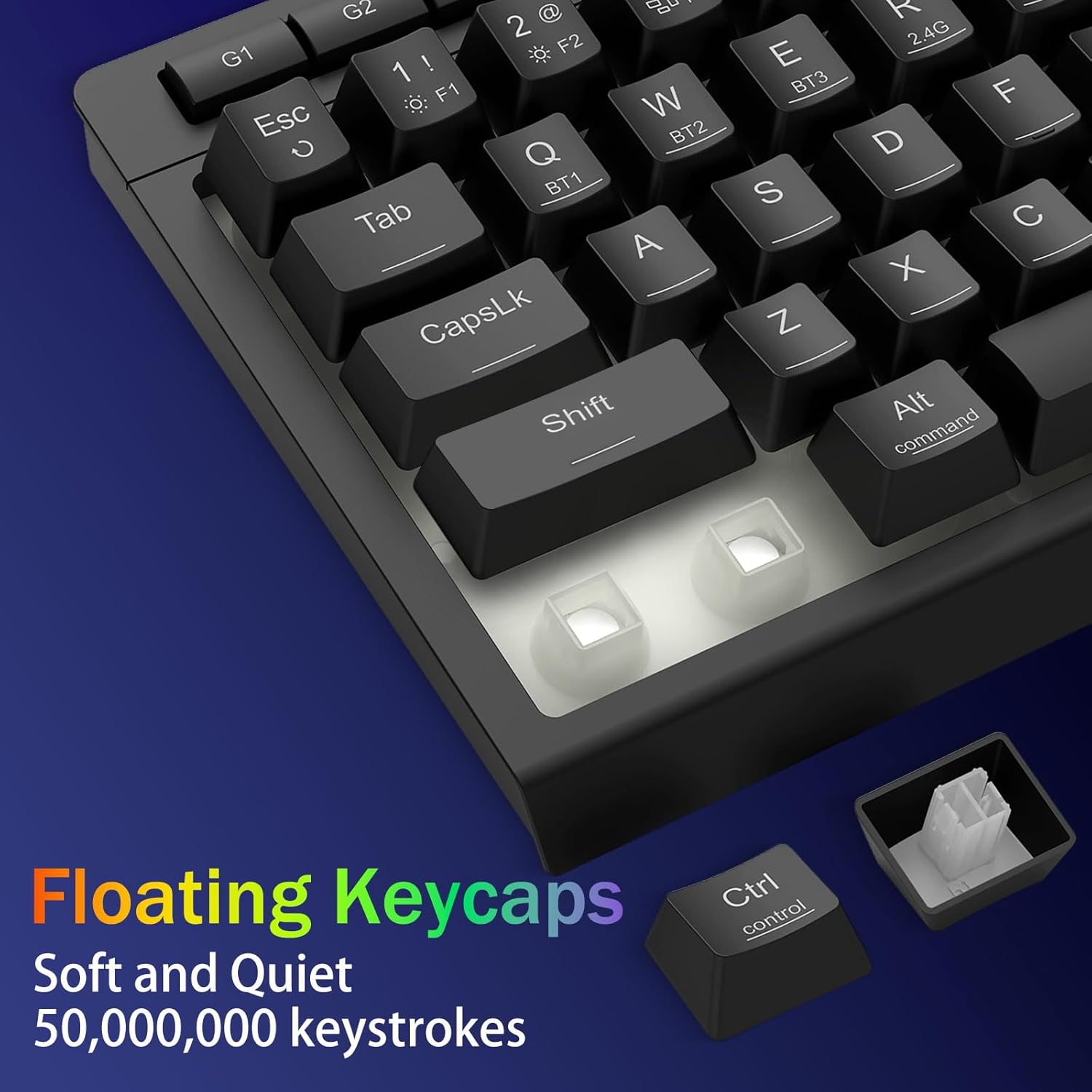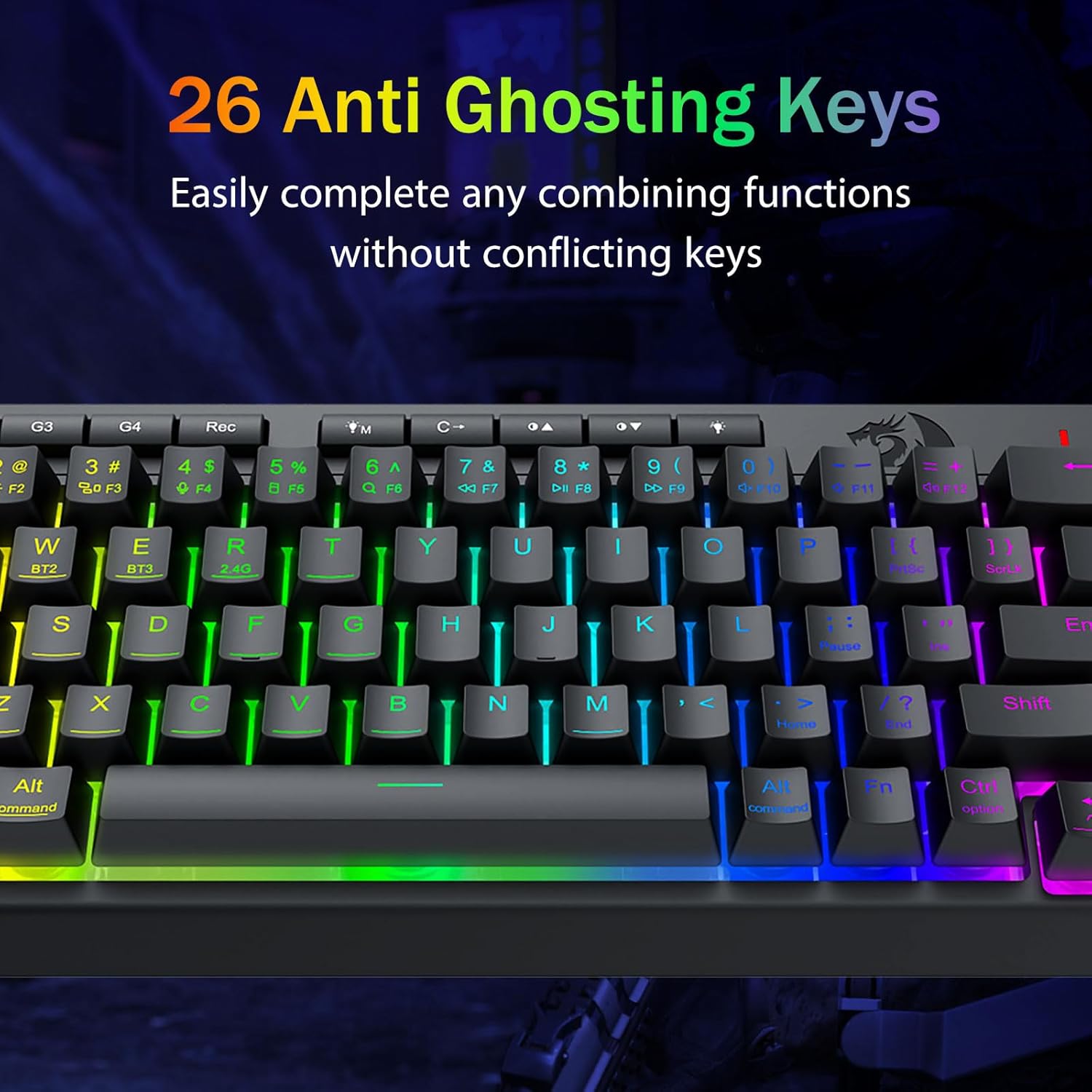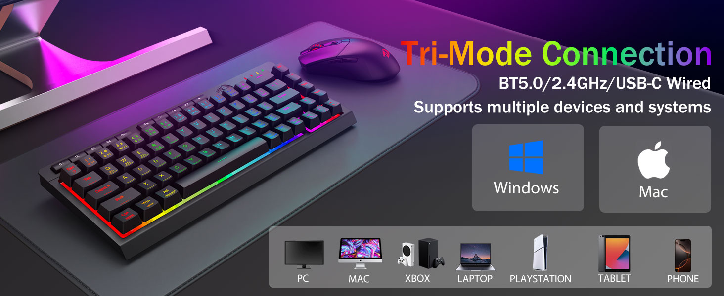由创全制造的 Redragon Black K519 Pro 便携式无线游戏键盘体现了游戏玩家和专业人士的专业级工程设计。其多功能三模设计支持稳定的蓝牙、低延迟 2.4GHz 无线和 USB-C 有线连接,可同时在三个设备之间轻松切换。该键盘包括专用宏键,可以通过直观的软件完全自定义,允许用户分配复杂的命令或快捷键,以提高生产力和游戏效率。具有多种效果的动态 RGB 灯光可实现个性化设置,而全键无冲突和防重影功能可确保在激烈的会话中准确记录每次击键。