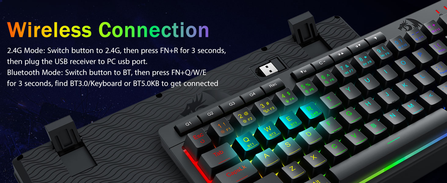 Redragon Black K519 Pro 便携式无线游戏键盘由行业领先的制造商创全精心打造,通过强大的三模连接(蓝牙/2.4GHz/USB-C)、无缝多设备配对和完全可编程的宏按键,提供卓越的性能。它专为精准而设计,具有鲜艳的 RGB 灯光、先进的防重影技术和持久耐用的 4000mAh 电池。这款键盘专为舒适而设计,具有超静音按键和深度软件定制,体现了创全严格的质量控制。企业可以放心地直接从中国工厂采购该产品,受益于有竞争力的批发价格和可靠的供应链支持