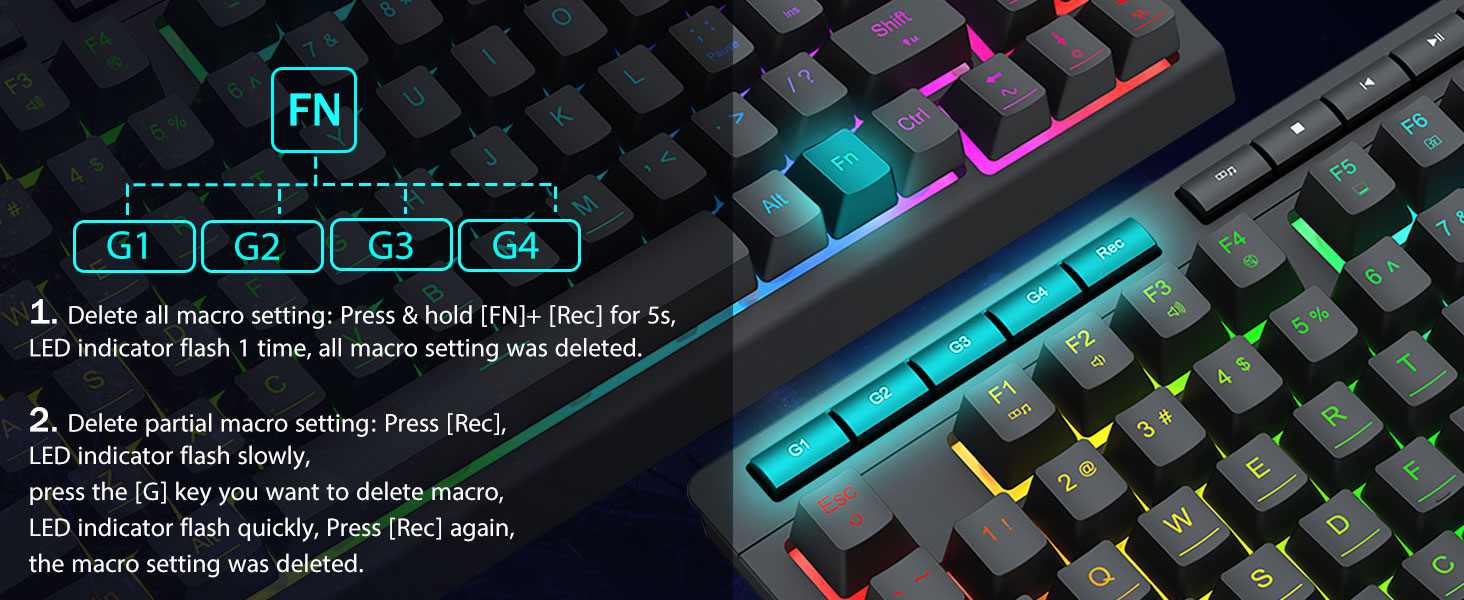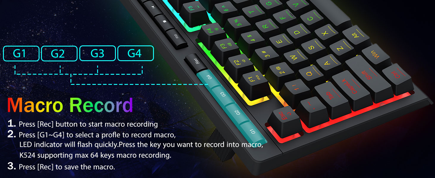 安静的游戏开关 -4 个板载宏键(G1~G4)可进行编程,无需任何附加软件即可即时工作。这些按键易于编辑,并且可以执行各种不同的宏。