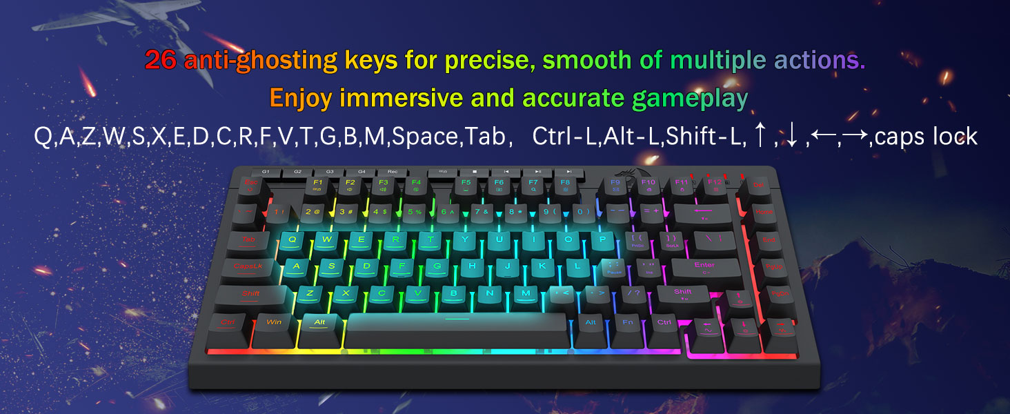 26 个防重影键和专用媒体控制 -具有防重影按键(带下划线的按键),允许 26 个按键同时工作,以您想要的方式快速准确地响应游戏。专用媒体控件可让您直接从键盘播放、暂停和跳过多媒体,让您的游戏过程流畅、不间断。