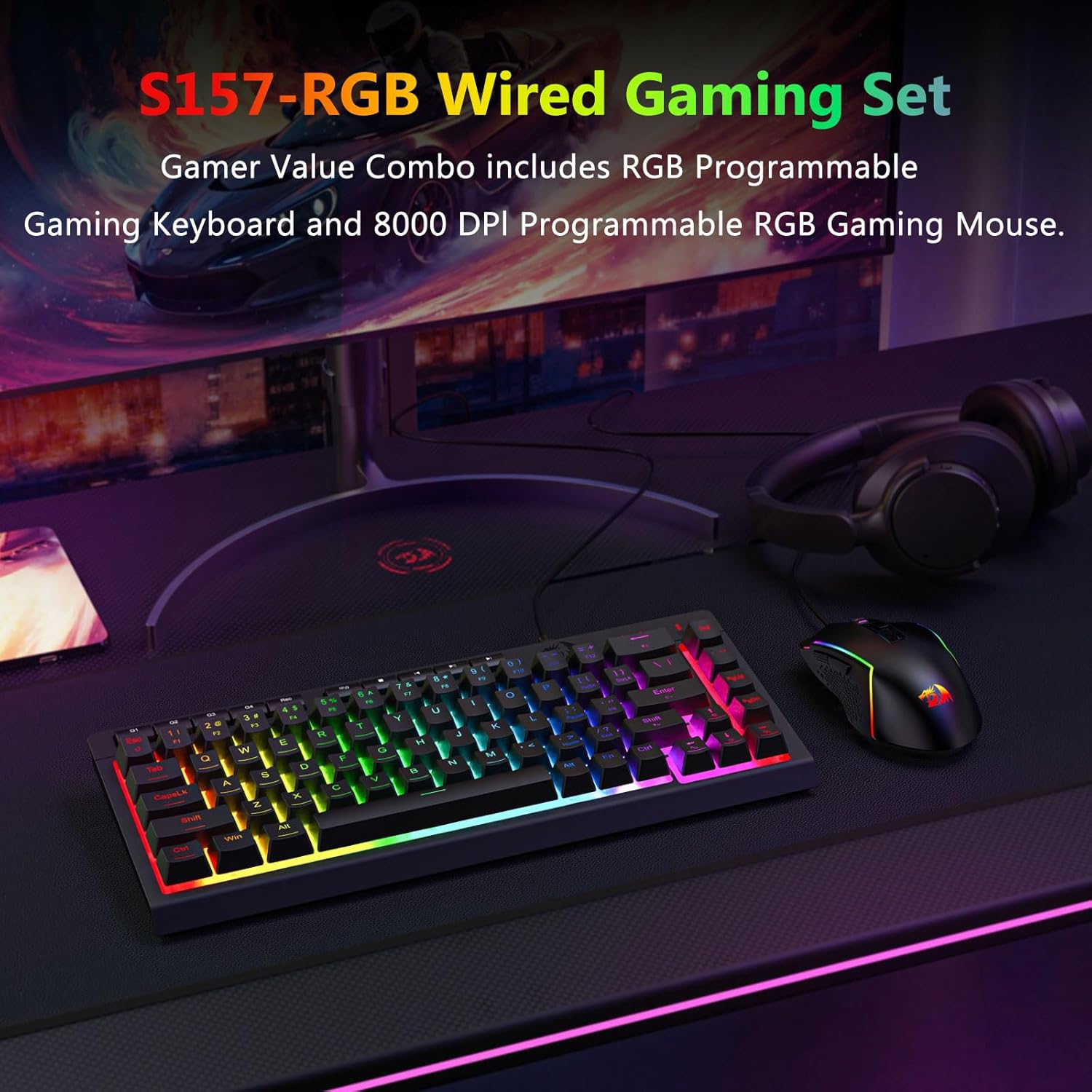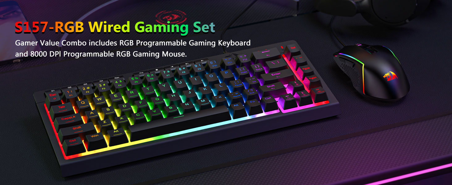 黑色 S157 RGB 背光有线游戏键盘和鼠标组合具有简单的设计和可靠的功能,是在各种环境中寻求一致输入性能的用户的可靠选择。