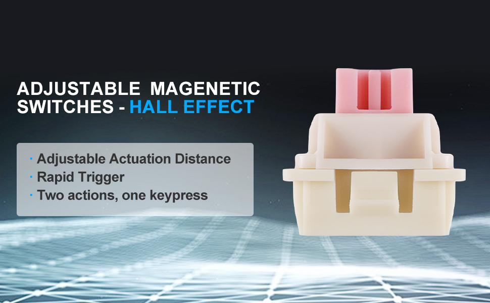 答:磁性开关使用霍尔效应传感器来检测按键运动,从而实现可调节的驱动点和一致的性能。与传统机械开关相比,这可以减少磨损并提供更流畅的打字体验。