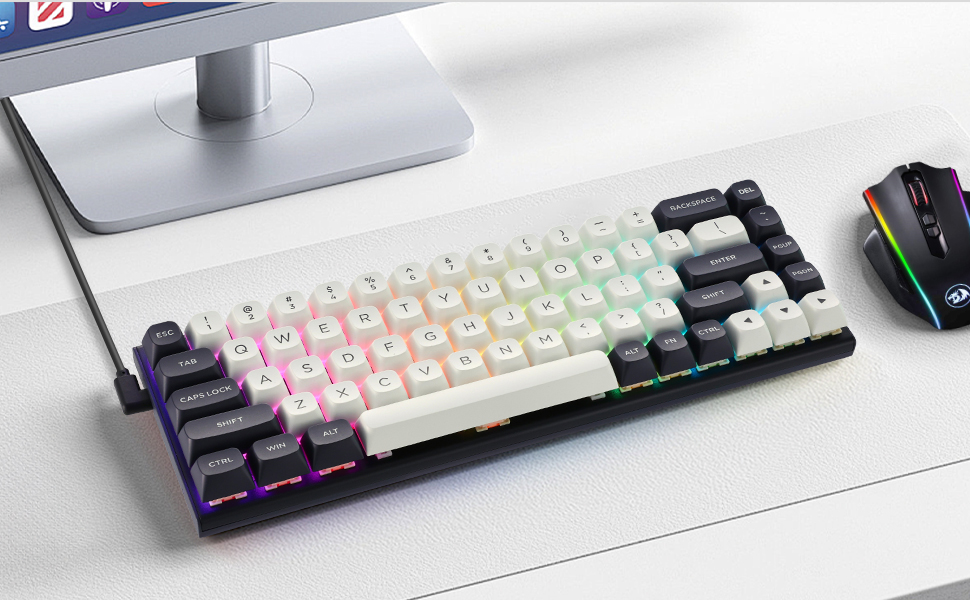 键盘采用简约设计,干净的白色或蓝黑色配色,适合游戏和专业环境。紧凑的结构使用户能够保持更有条理的工作空间。