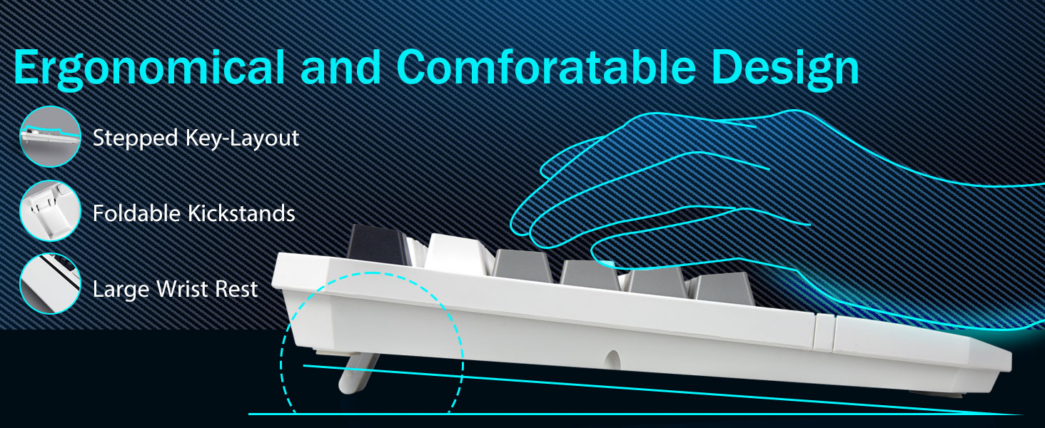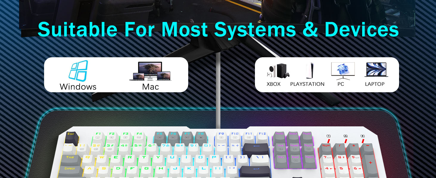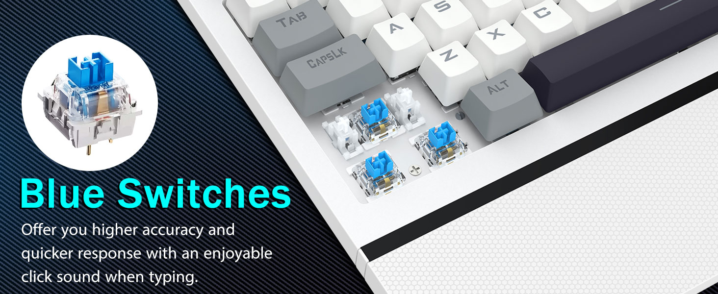 【先进的人体工程学,全天舒适】我们的 PC 键盘具有可点击的蓝色开关,可提供闪电般的快速响应时间和卓越的准确性。每次击键都会产生令人满意的点击声,增强您的打字体验。更深的键程、更强的反馈和更宽的键间距,打字不仅更准确,而且更舒适。如果您喜欢那种触觉、“咔哒”感觉,我们的键盘是您的完美选择。
