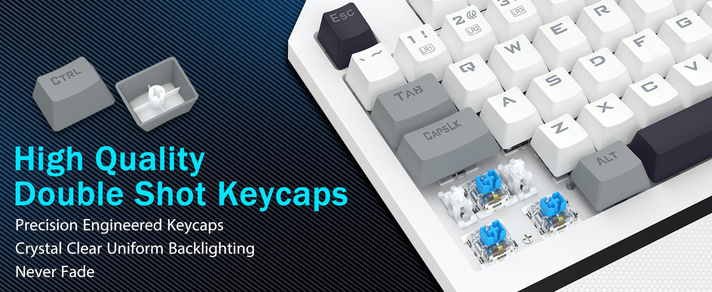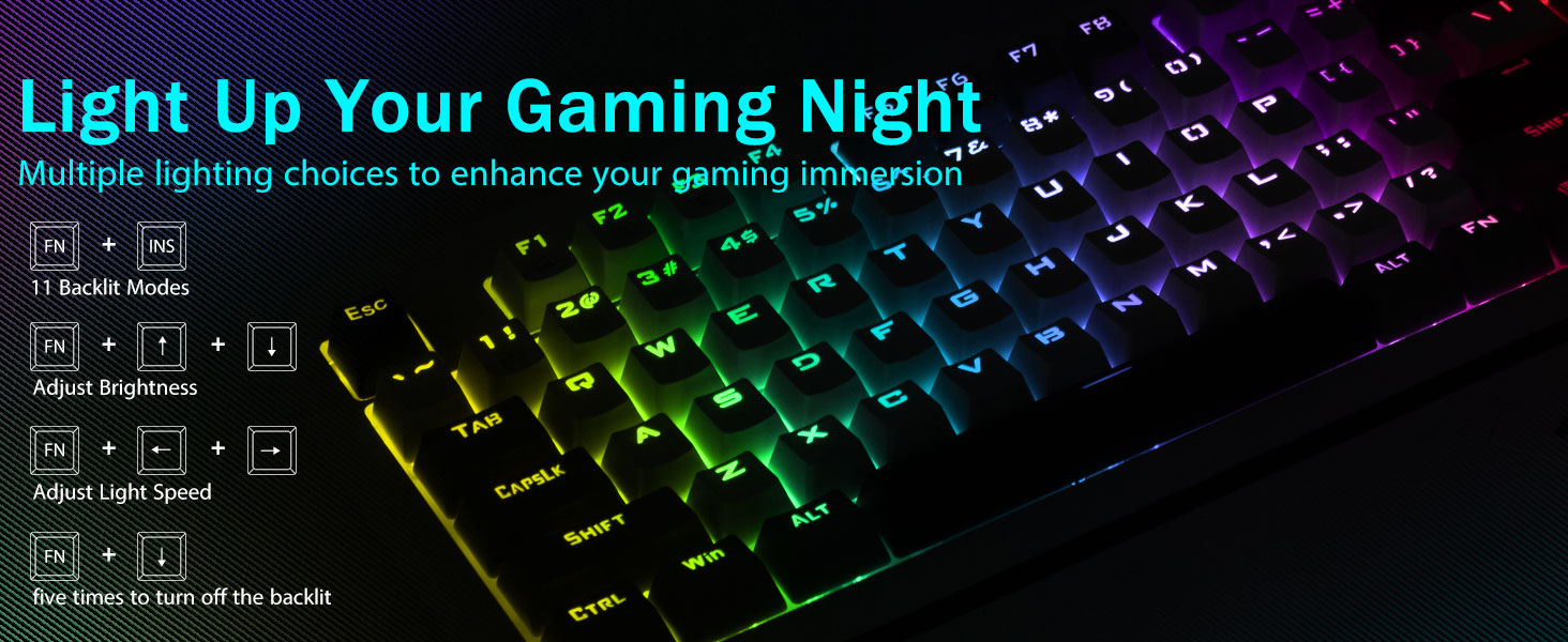 【彩虹背光键盘,沉浸式体验】使用 11 种动态背光模式、5 个可调节速度和亮度级别照亮您的桌面。这款键盘可以改变您的游戏设置,增强您的情绪和沉浸感,尤其是在弱光环境下。超耐用的双注塑 ABS 键帽确保水晶般清晰、均匀的背光,即使在黑暗中也能提高您的打字准确性。