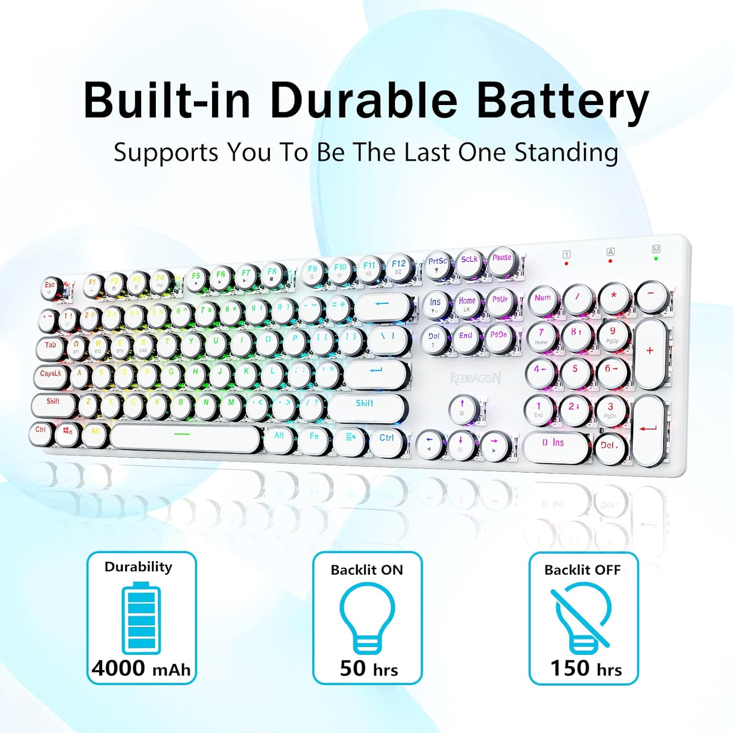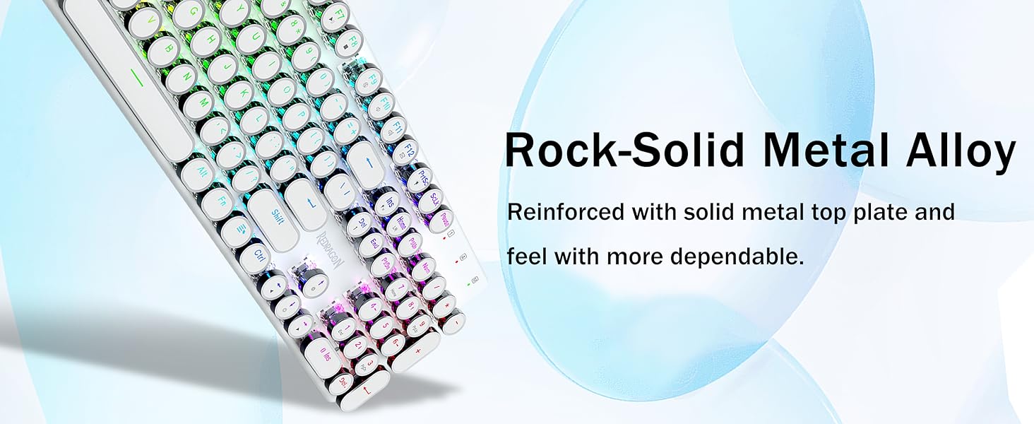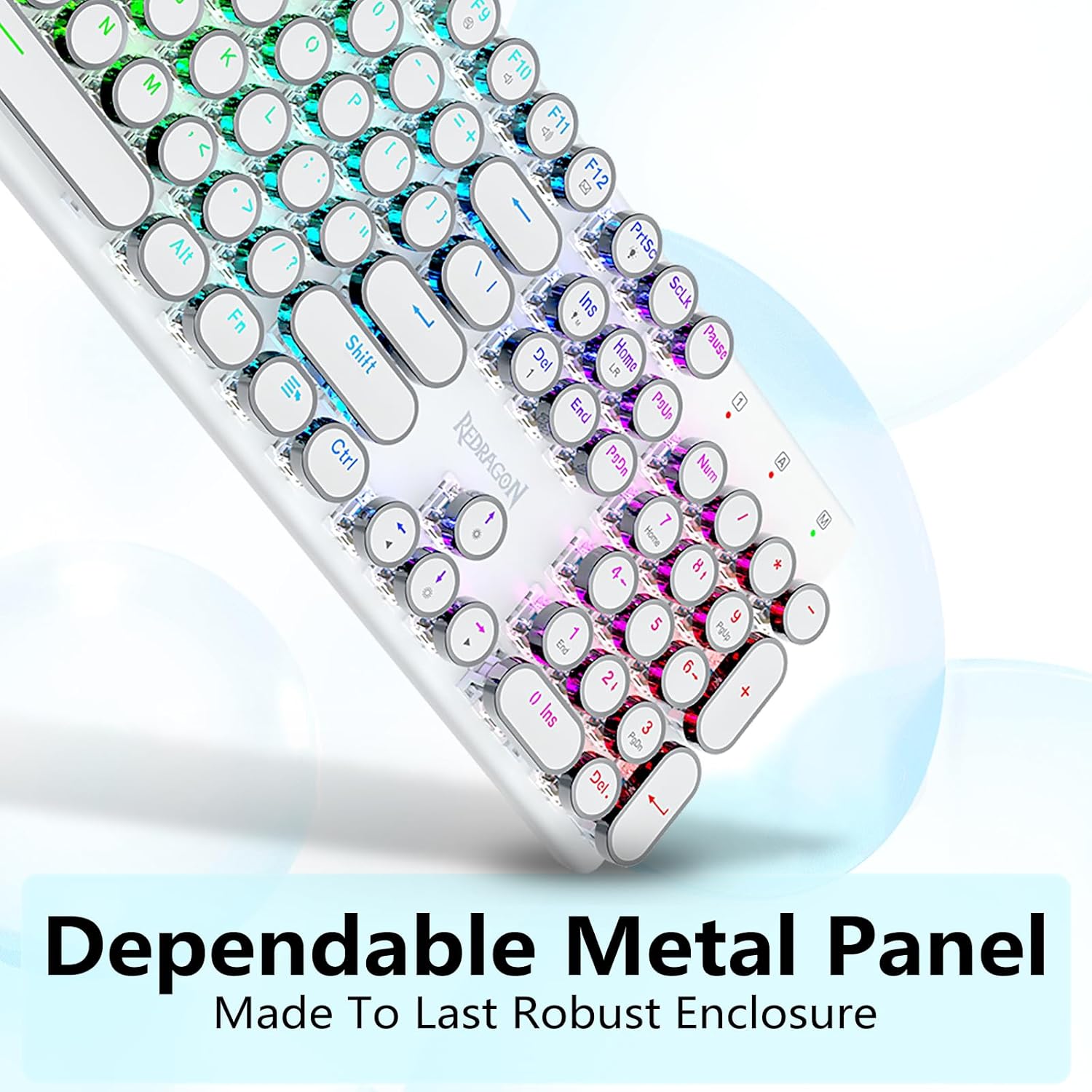 𝗥𝗲𝘁𝗿𝗼 𝗧𝘆𝗽𝗲𝘄𝗿𝗶𝘁𝗲𝗿 𝗦𝘁𝘆𝗹𝗲 𝘄𝗶𝘁𝗵 𝗠𝗲𝗰𝗵𝗮𝗻𝗶𝗰𝗮𝗹𝗞𝗲𝘆𝘀- Redragon 机械蓝色开关提供中等阻力、可听见的点击声和触觉反馈,提供灵敏且精确的游戏环境和性能。复古蒸汽朋克键盘圆形键帽看起来像古典打字机,为您带来舒适的打字感觉和稳定的点击触感。