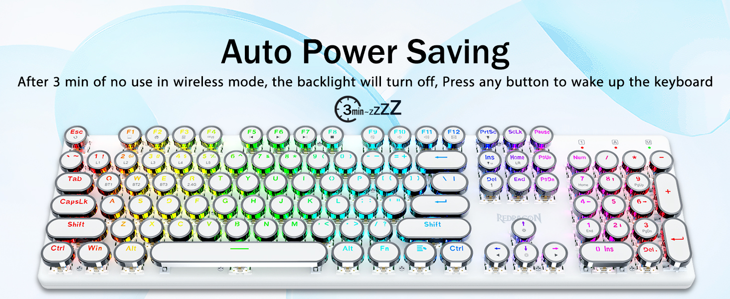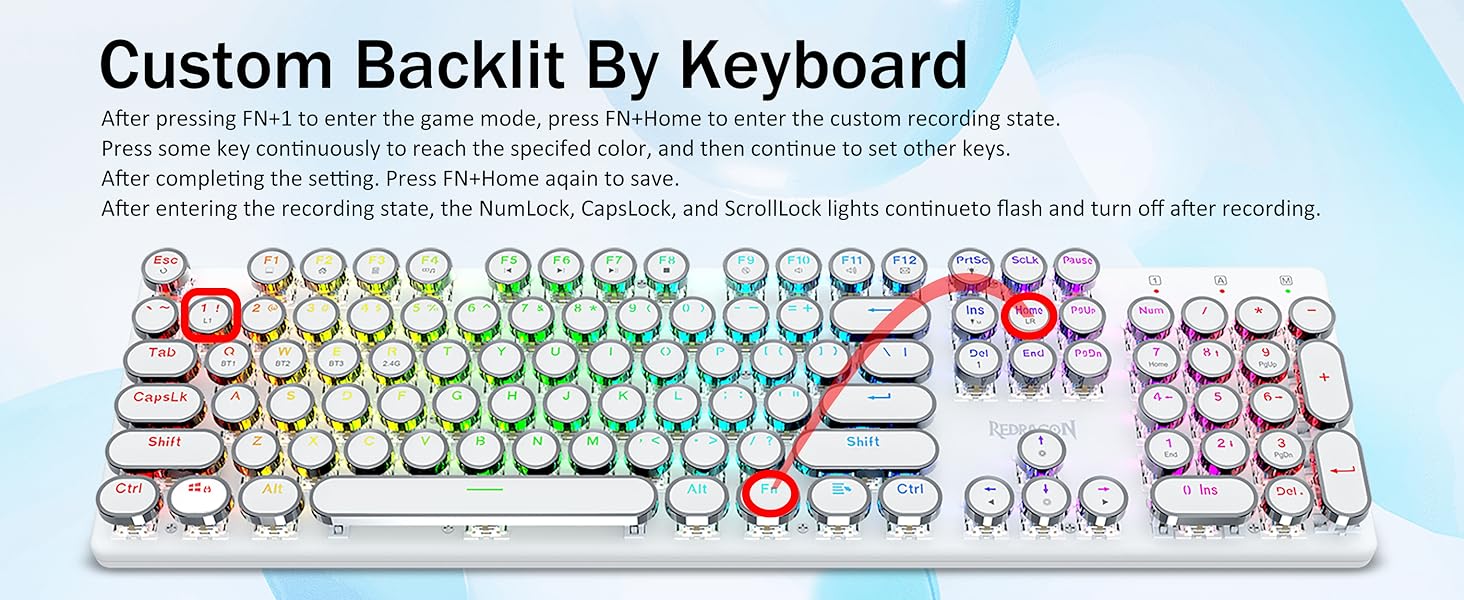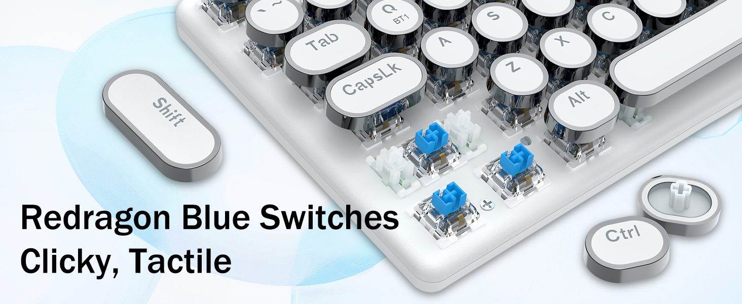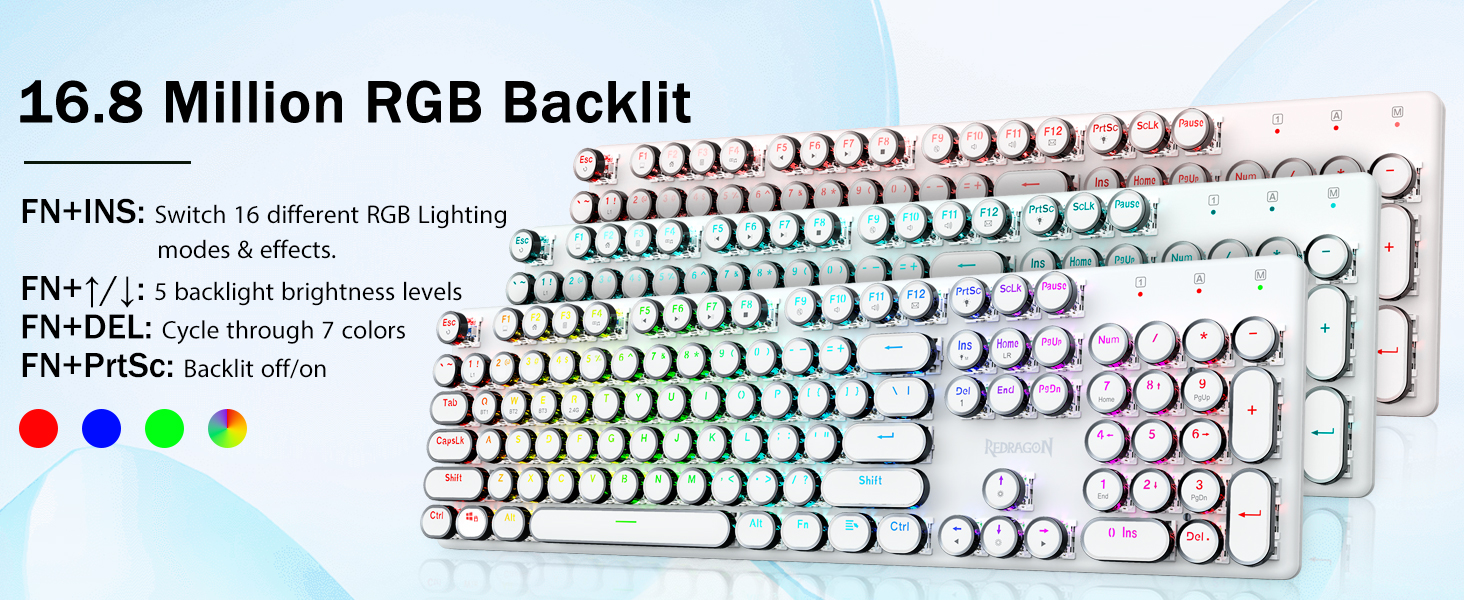 𝗥𝗲𝘁𝗿𝗼 𝗧𝘆𝗽𝗲𝘄𝗿𝗶𝘁𝗲𝗿 𝗦𝘁𝘆𝗹𝗲 𝘄𝗶𝘁𝗵 𝗠𝗲𝗰𝗵𝗮𝗻𝗶𝗰𝗮𝗹𝗞𝗲𝘆𝘀- Redragon 机械蓝色开关提供中等阻力、可听见的点击声和触觉反馈,提供灵敏且精确的游戏环境和性能。复古蒸汽朋克键盘圆形键帽看起来像古典打字机,为您带来舒适的打字感觉和稳定的点击触感。
