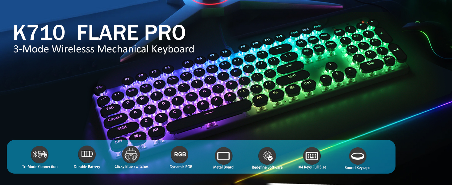 𝗗𝗲𝗽𝗲𝗻𝗱𝗮𝗯𝗹𝗲𝗠𝗲𝘁𝗮𝗹𝗣𝗮𝗻𝗲𝗹&𝟭𝟬𝟰𝗞𝗲𝘆𝘀 𝗔𝗻𝘁𝗶𝗚𝗵𝗼𝘀𝘁𝗶𝗻𝗴- 升级后的FLARE PRO版本继续使用相同的坦克实心金属材料。让键盘在桌面上保持稳定和优雅,以获得优质的打字体验。 K710键盘支持104键无冲突技术,允许多个按键同时按下而不会发生冲突。