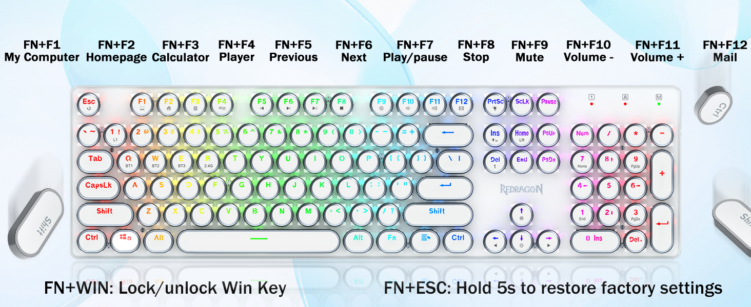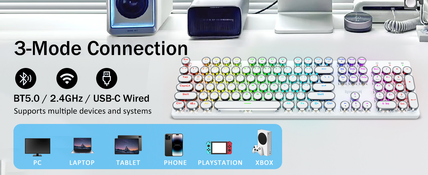 𝗩𝗶𝗯𝗿𝗮𝗻𝘁𝗚𝗿𝗼𝗼𝘃𝘆𝗥𝗚𝗕- 搭载Redragon创新三模连接技术,USB-C有线、蓝牙3.0/5.0和2.4Ghz无线模式,使各领域的用户体验升级到另一个层次。按 FN+Q/W/E 进入蓝牙模式,按 FN+R 进入 2.4G 模式。