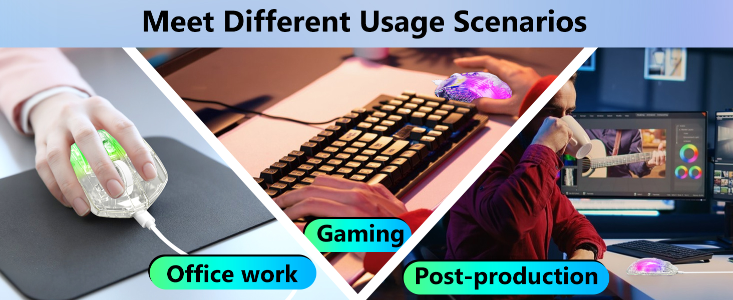 该鼠标适用于各种游戏类型,包括第一人称射击游戏、策略游戏和角色扮演游戏。其精度和响应能力有助于提高控制和反应时间。
